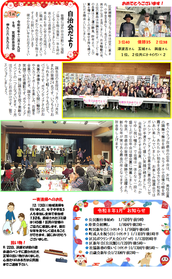 区民一斉清掃 | 区民親睦グラウンドゴルフ大会 | 講座 七宝てまり | 自治会だより7号 |
