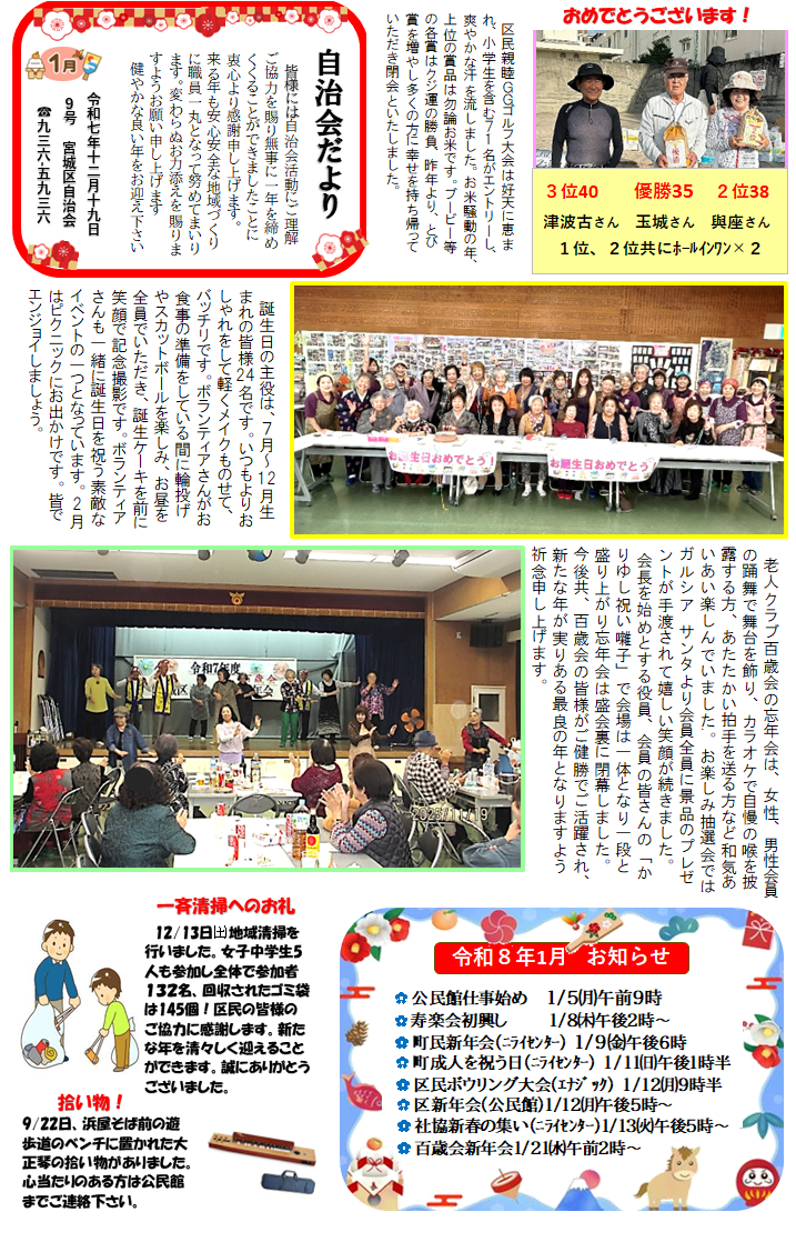 | 12月カレンダ- | 12/18 区民一斉清掃のお知らせ | 12/18 区民親睦グラウンドゴルフ大会 |