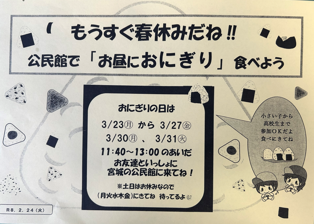 公民館でお昼におにぎり | 新1年生・進級祝う会 |